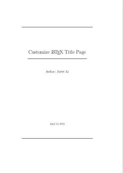 图 1 的封面通过 LaTeX 实现起来非常简单,我们只需要会使用几个基本的命令就足够了。从图中我们可以将封面分为六个部分,它们分别是最上面的横线、居中的标题、标题下的横线、作者信息、日期以及封面底部的横线。如下所示: