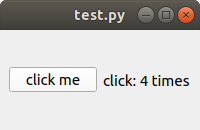 1 2 3 4 5 6 7 8 9 10 11 12 13 14 15 16 17 18 19 20 21 22 23 24 25 26 27 28 29 30 31 32 33 34 35 36 37 38 39 40 41 import sysfrom PyQt5.QtWidgets import QLabelfrom PyQt5.QtWidgets import QWidgetfrom PyQt5.QtWidgets import QPushButtonfrom PyQt5.QtWidgets import QHBoxLayoutfrom PyQt5.QtWidgets import QMainWindowfrom PyQt5.QtWidgets import QApplicationclass TestApp (QMainWindow ): def __init__ (self ): super ().__init__() self .clicknum = 1 hbox = QHBoxLayout() self .label = QLabel('Hello' ) self .button = QPushButton('click me' ) self .button.clicked.connect(lambda : self .clickMe(self .clicknum)) hbox.addWidget(self .button) hbox.addWidget(self .label) widget = QWidget() widget.setLayout(hbox) self .setCentralWidget(widget) self .show() def clickMe (self, clicknum ): if clicknum > 1 : message = 'click: {0} times' .format (clicknum) else : message = 'click: {0} time' .format (clicknum) self .label.setText(message) self .clicknum += 1 if __name__ == '__main__' : app = QApplication(sys.argv) testapp = TestApp() sys.exit(app.exec_())